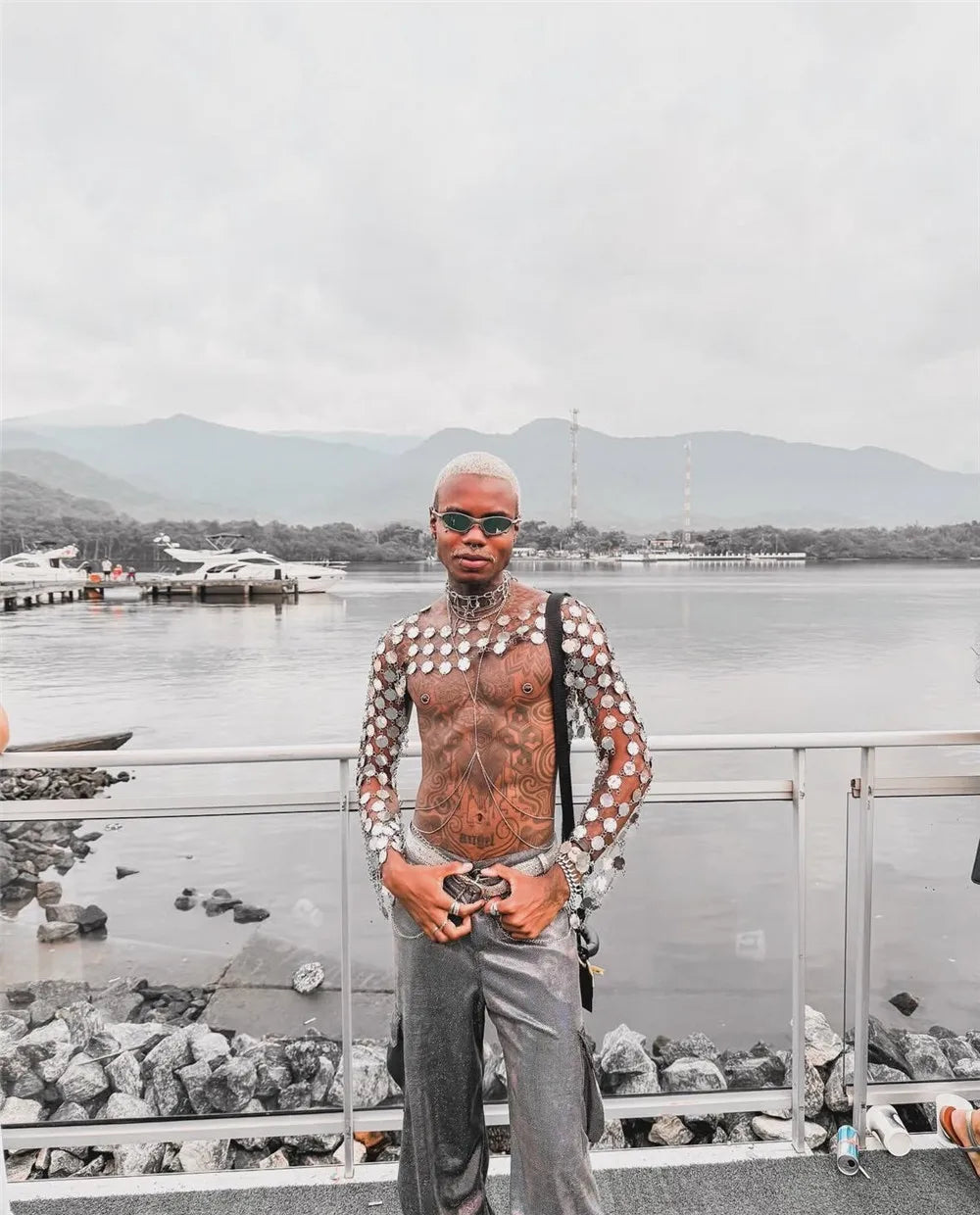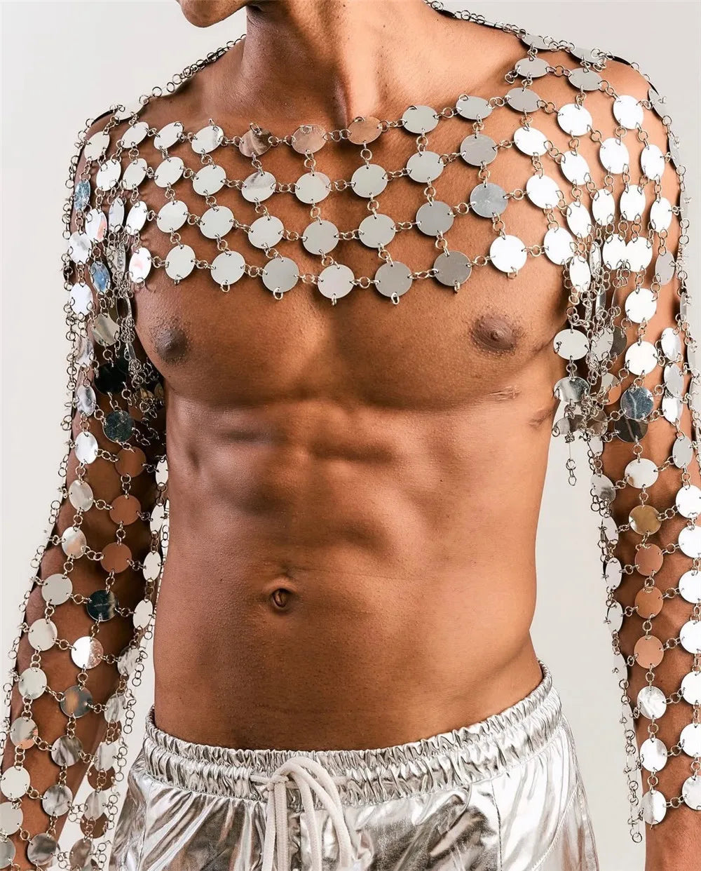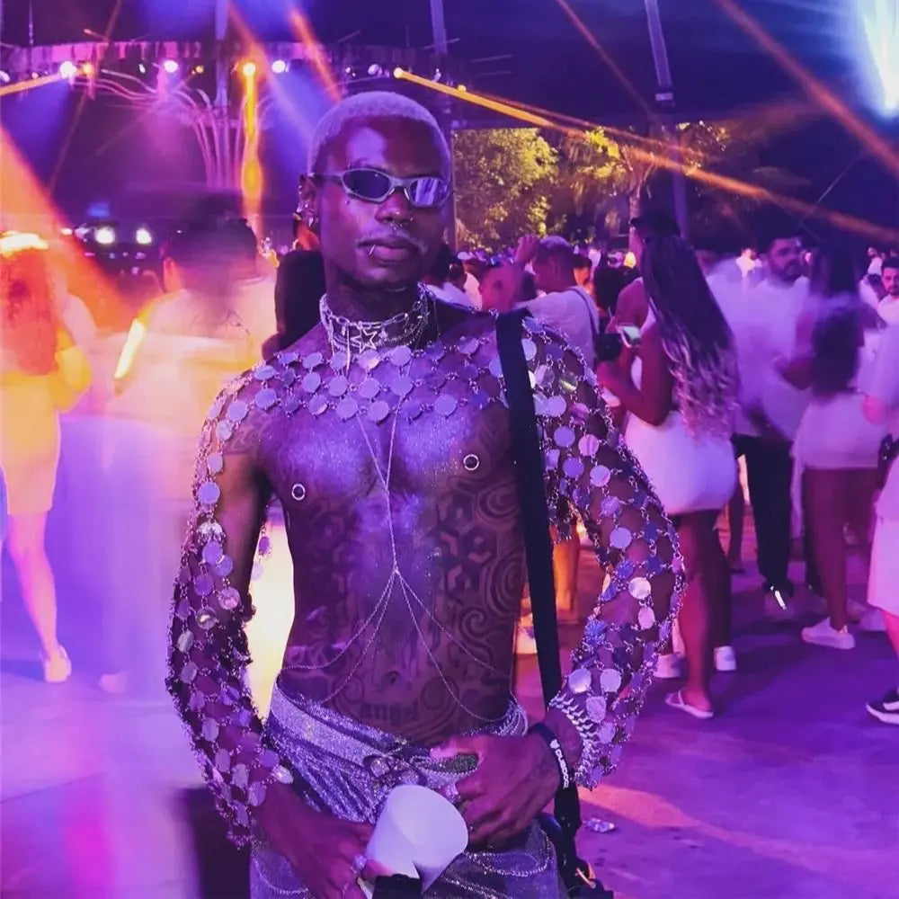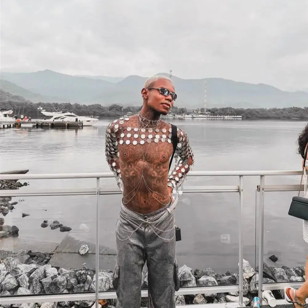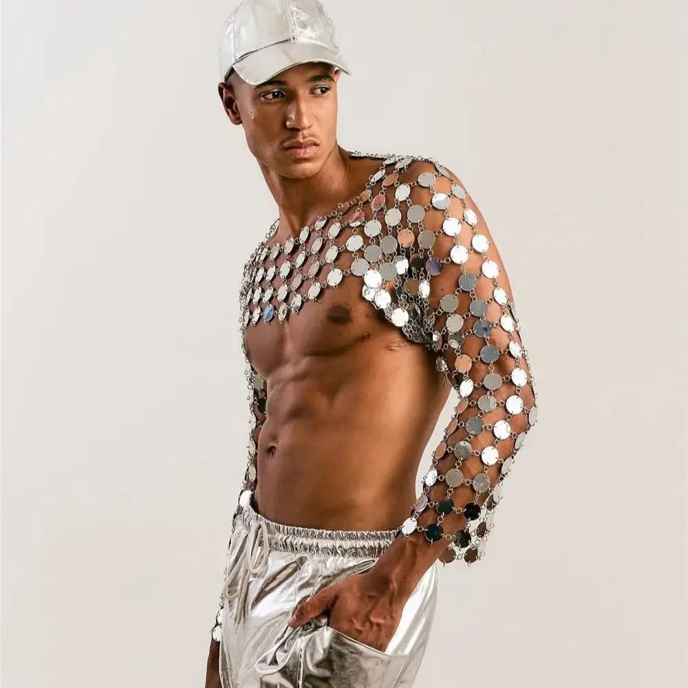 Make a bold statement with this edgy metal chain crop top featuring interconnected circular discs that create a stunning armor-inspired look. The metallic discs catch and reflect light from every angle, creating a mesmerizing effect as you move. The flexible chain construction drapes naturally over your shoulders and torso, providing comfortable coverage while maintaining the piece's striking industrial aesthetic. The open design allows for breathable wear during long nights of dancing and celebrating. This versatile one-size piece adjusts to various body types and pairs perfectly with pants, shorts, or layered over other tops for an unforgettable festival look that channels warrior energy.